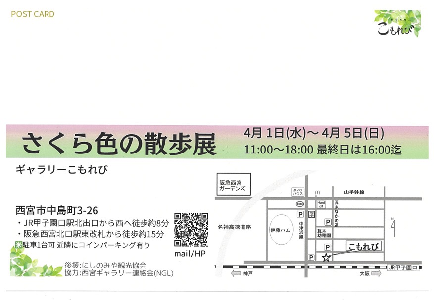 ギャラリーこもれびは、JR甲子園口駅北出口から西へ徒歩約8分、阪急西宮北口駅東改札から徒歩約15分にあります。